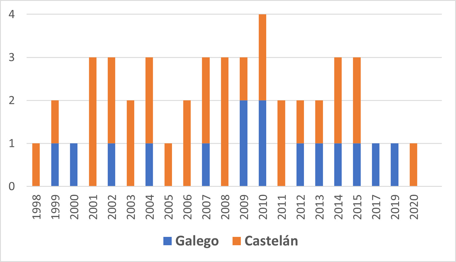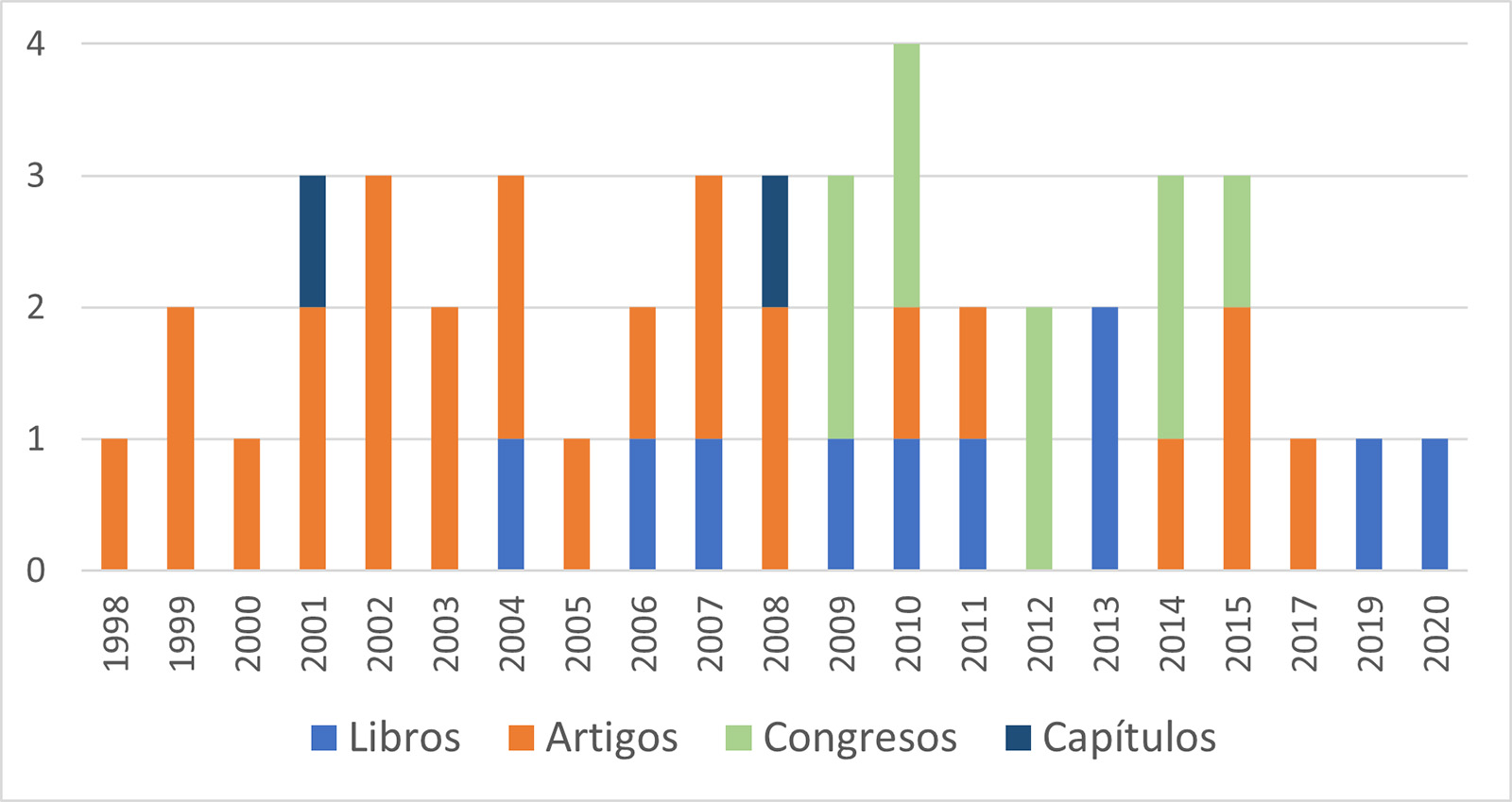No gráfico 1 reflíctese a distribución cronolóxica das publicacións indicando a súa tipoloxía. Os máis numerosos son os artigos (54,3 %), seguidos dos libros (21,7 %) e dos congresos (19,6 %), alén de dous capítulos de libro (4,4 %). Todos eles espállanse equilibradamente entre 1998 e 2020: no inicio concéntranse os artigos, que nunca perden importancia, os libros comezan no 2004 e manteranse ata o 2020, e os congresos agrúpanse entre 2009 e 2015.